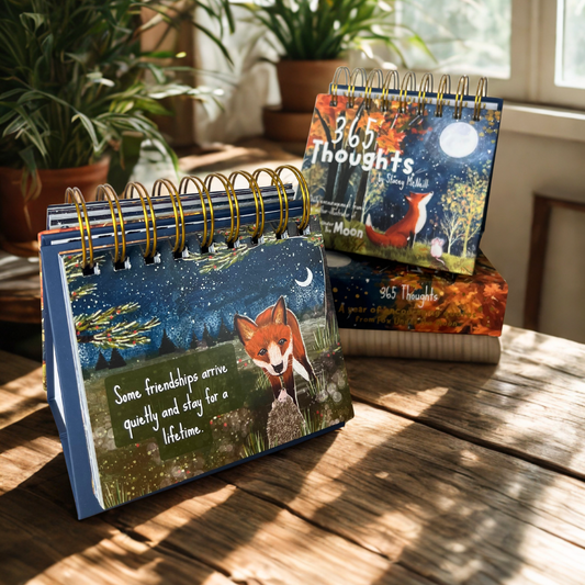 'One Step At A Time' is a hard backed gift book, featuring a collection of 10 rhyming tales aimed to encourage and inspire readers of all ages. Along side the book the range includes a paperback version of the book, a set of 16 premium foiled greeting cards, the signature fox under the moon foxy plush toy, a bookmark and a desktop 'thought for the day' flip-book.
