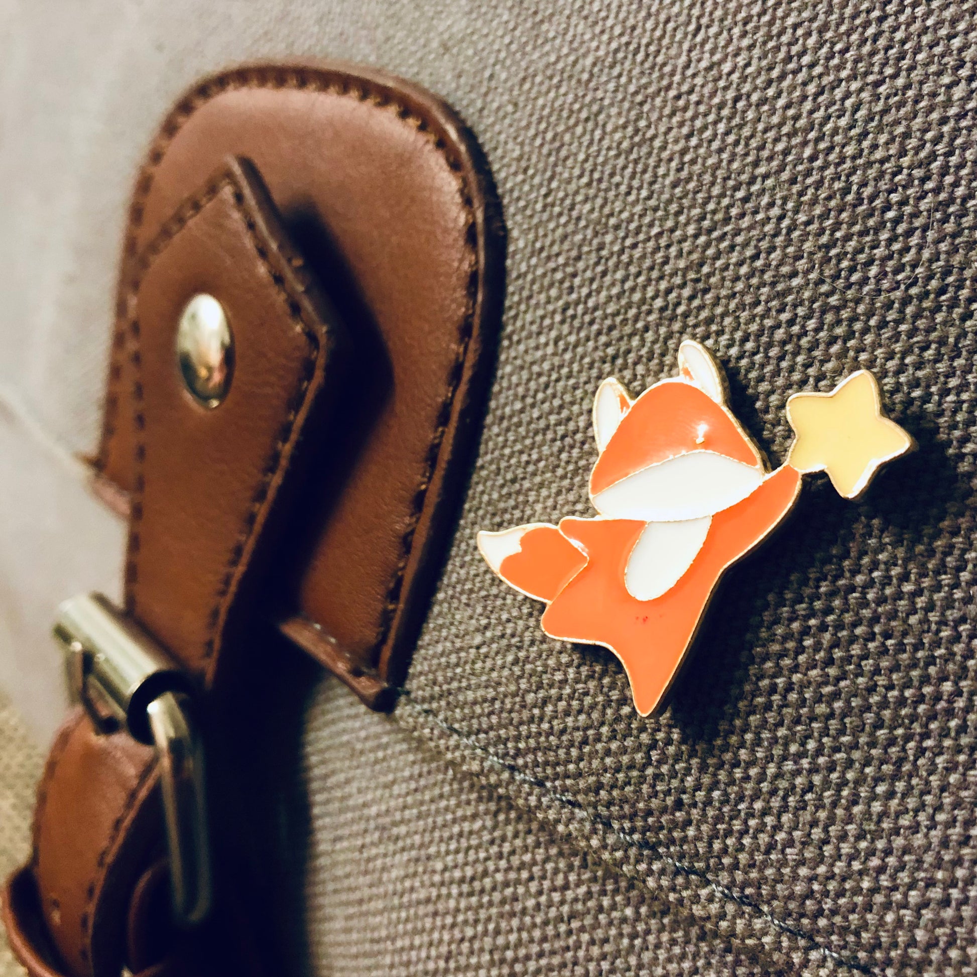 Fox and star enamel pin with rubber backing.