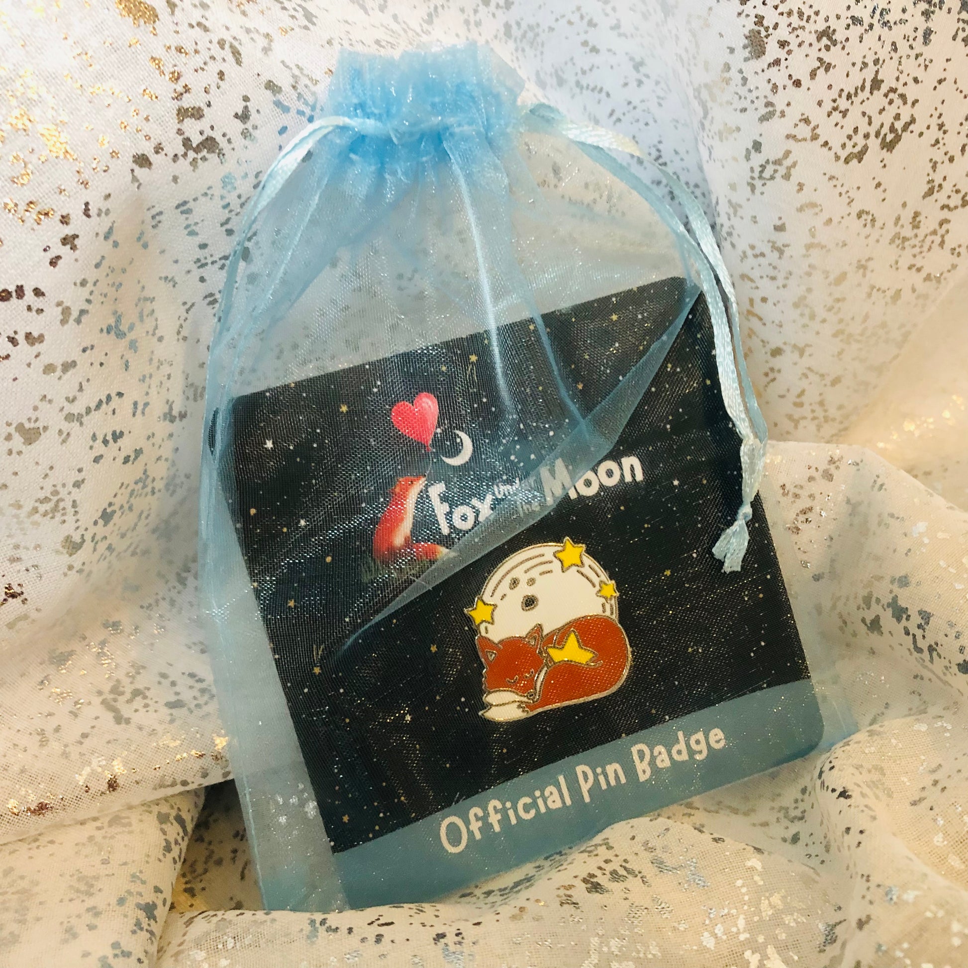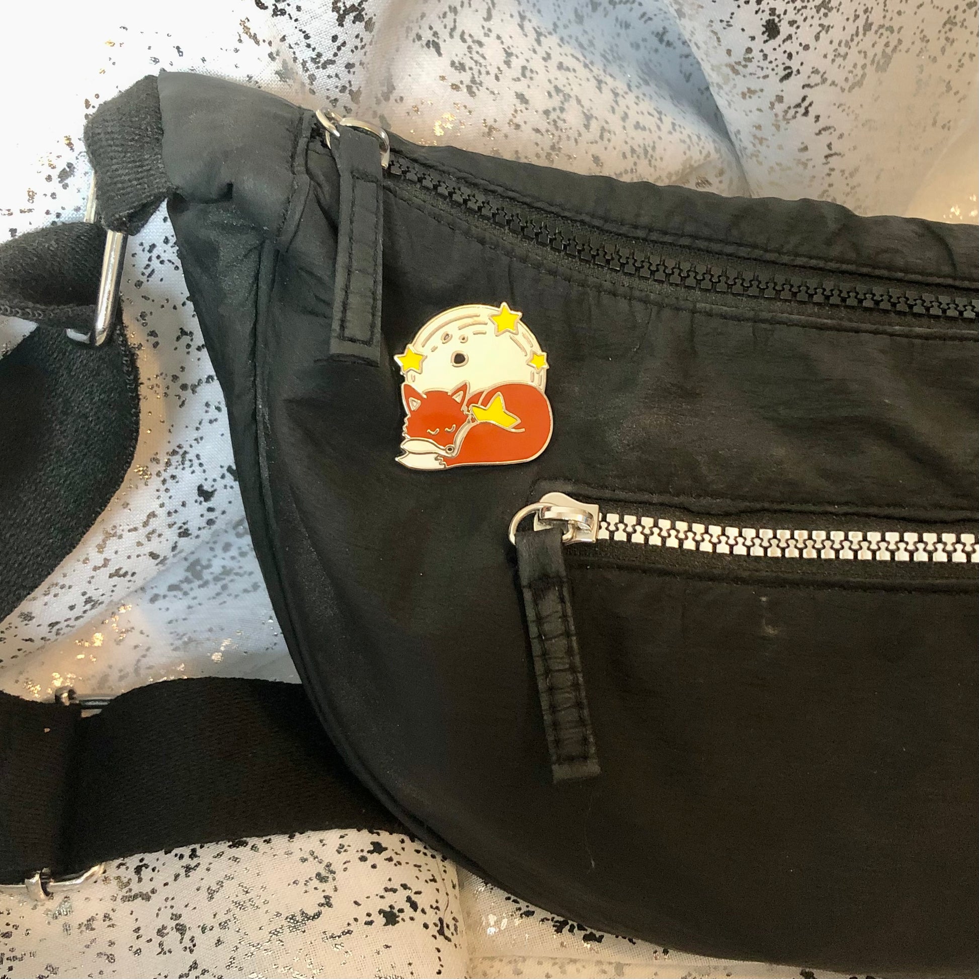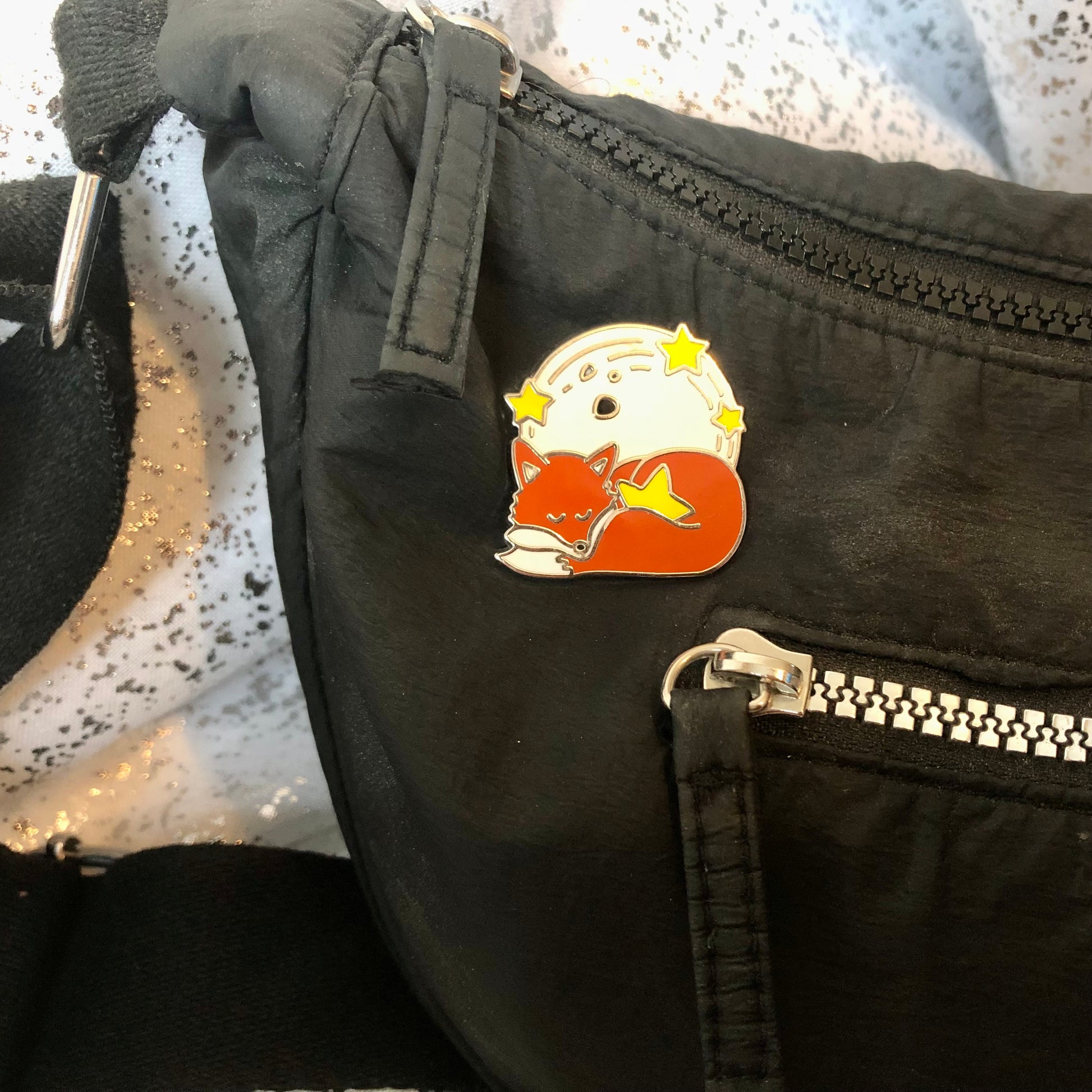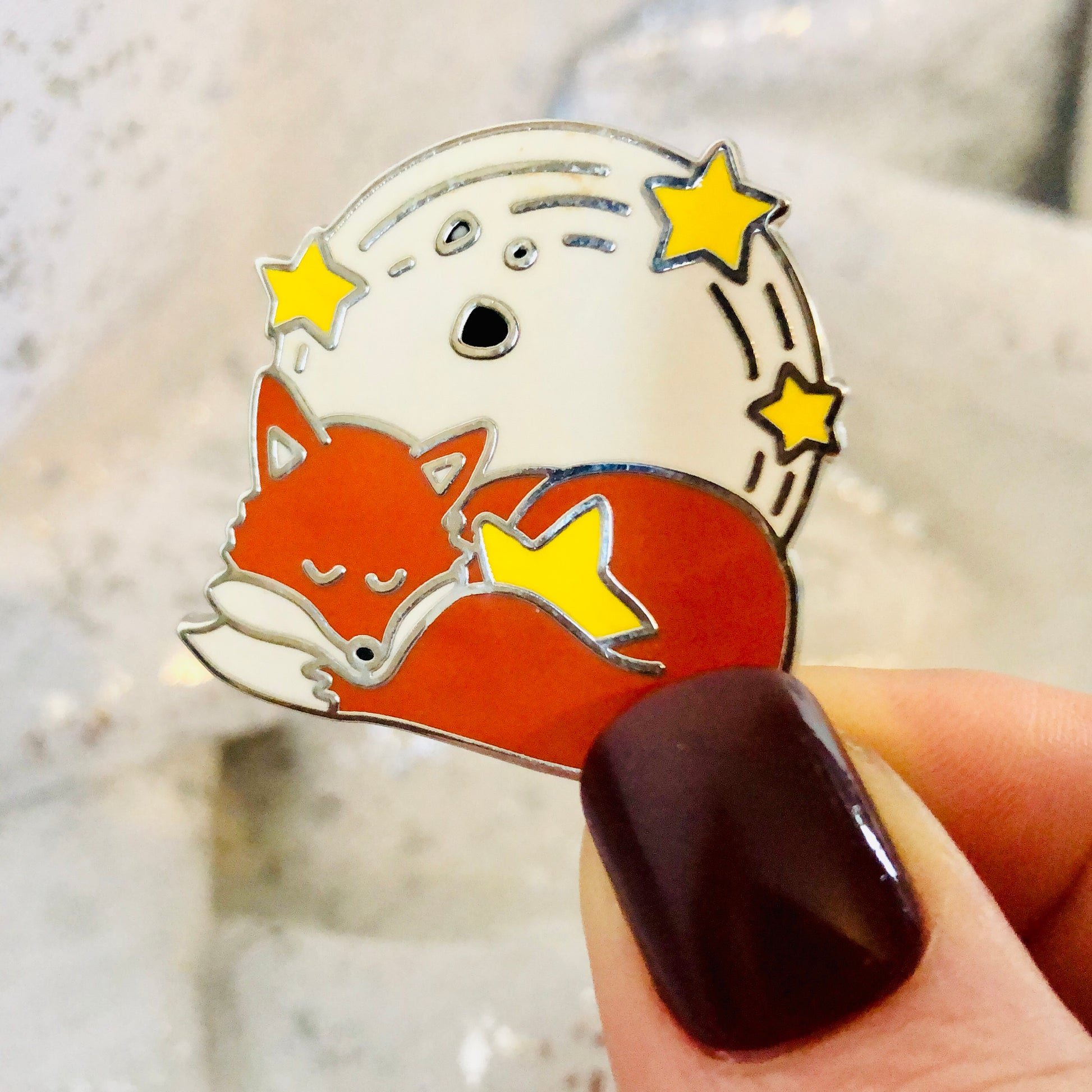 Our own-design enamel pin featuring a sleepy fox, hugging a little star under the full moon.