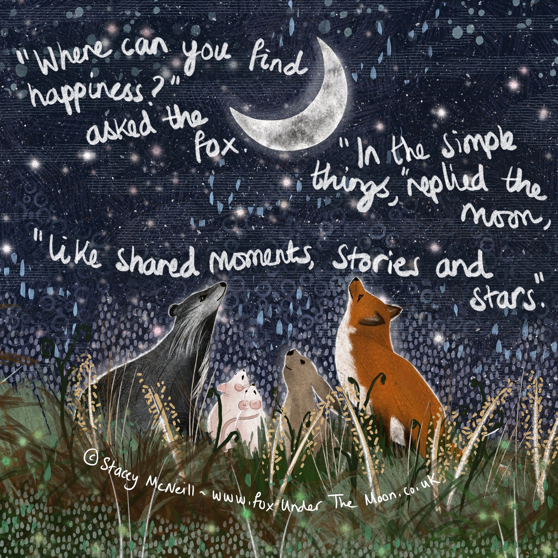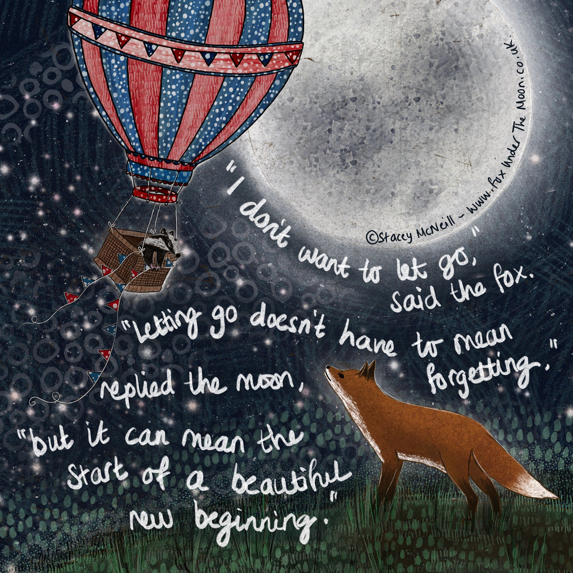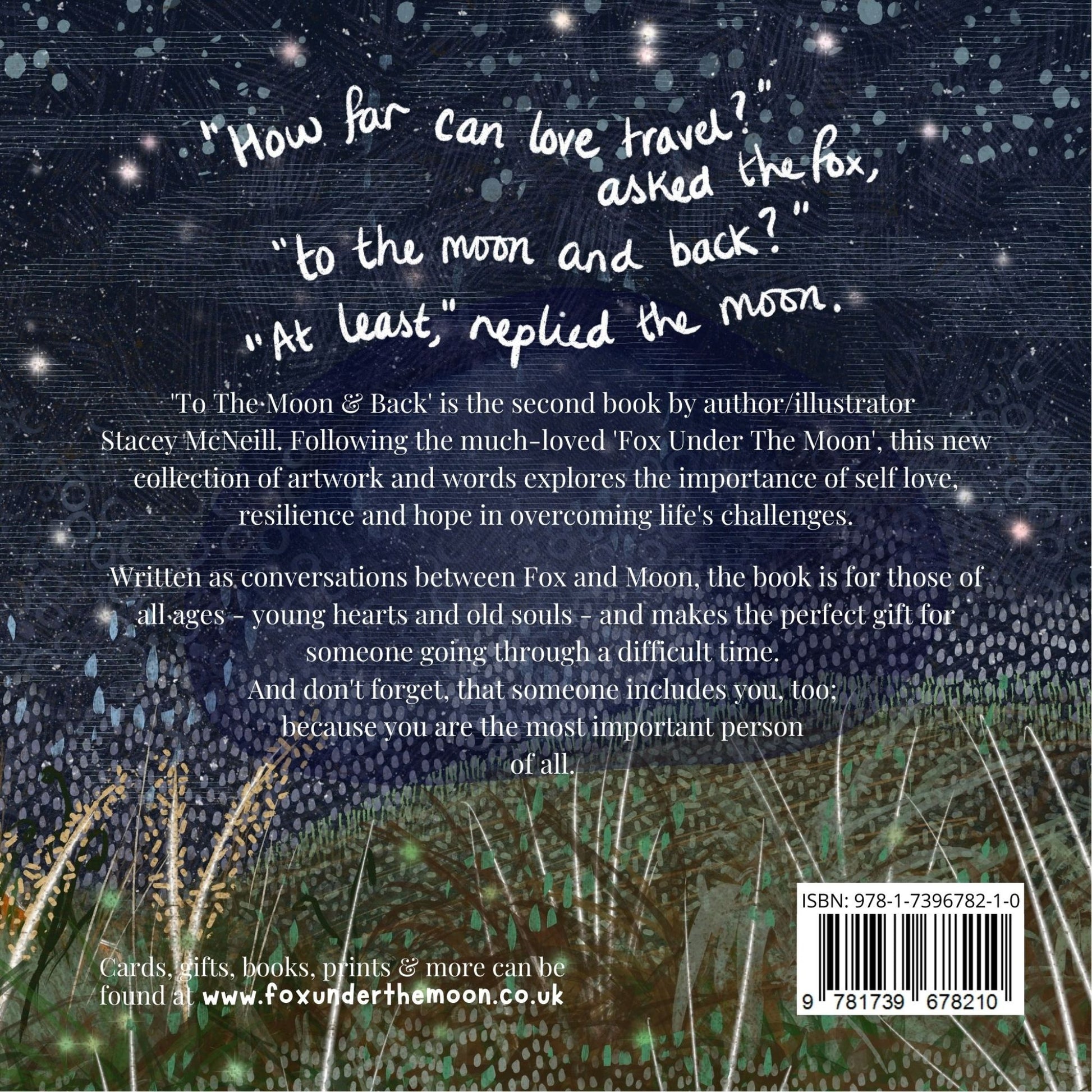 Blurb: 'To The Moon & Back' is the second book by author/illustrator Stacey McNeill. Following the much-loved 'Fox Under The Moon', this new collection of artwork and words explores the importance of self love, resilience and hope in overcoming life's challenges. Written as conversations between Fox and Moon, the book is for those of all ages - young hearts and old souls - and makes the perfect gift for someone going through a difficult time. And don't forget, that someone includes you, too; because you are the most important person of all.